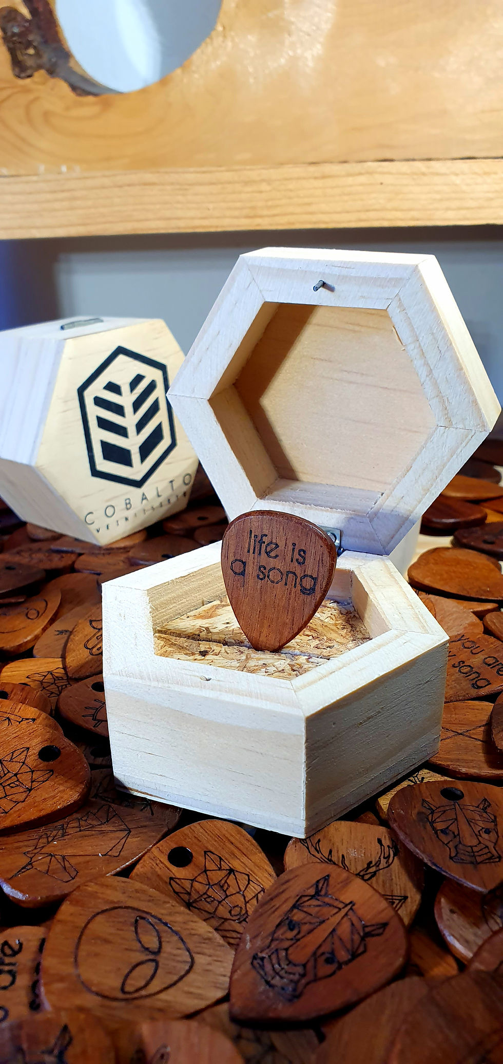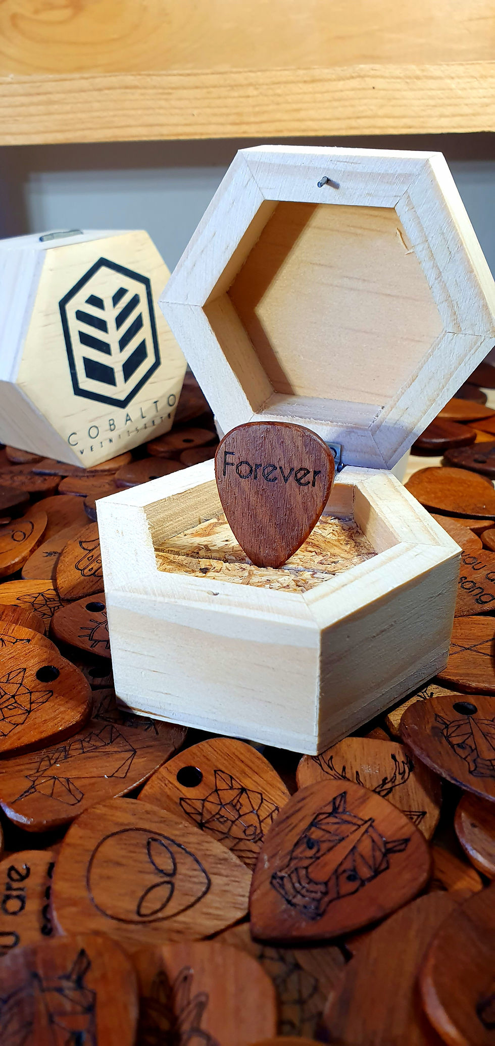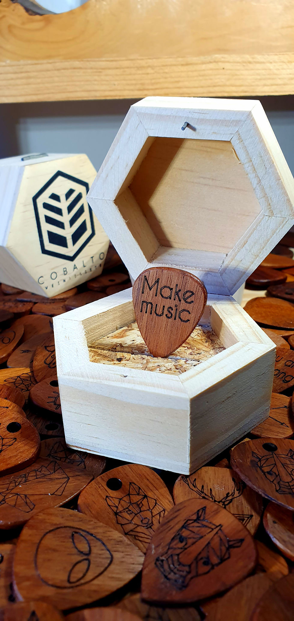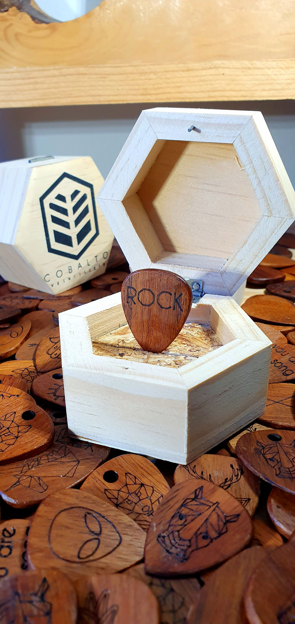 El plástico es uno de los materiales más populares de plumillas para tocar la guitarra hoy en día Cobalto Veintisiete dispone una amplia variedad en plumillas de MADERA el cual cambia y mejora el sonido y la acústica al tocarla.
